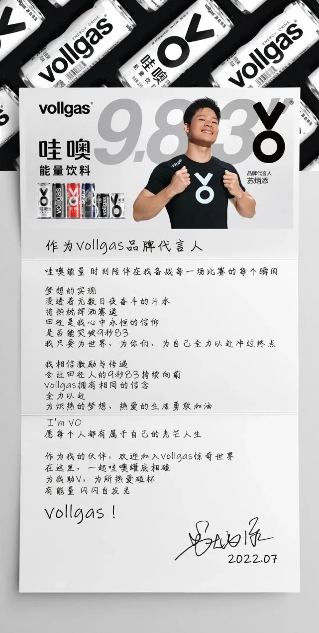 從首次代表中國出現(xiàn)在國際重量級的田徑賽場上以來,蘇炳添就從未停止過努力的步伐。通過科學(xué)的方法以及十年如一日的勤奮訓(xùn)練,突破亞洲人的生理極限,蘇炳添最終在2021年的東京奧運會賽場上創(chuàng)造了亞洲100米田徑新紀(jì)錄。這樣為熱愛的事業(yè)全力以赴的精神,與vollgas的品牌價值觀完美契合。