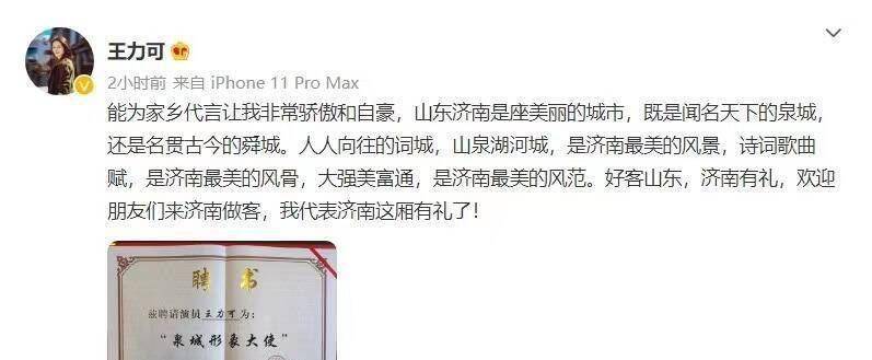 在受聘成為“泉城形象大使”之后,王力可也在個(gè)人社交媒體上與廣大粉絲分享了這一喜悅。王力可表示,“能為家鄉(xiāng)代言讓我非常驕傲和自豪,山東濟(jì)南是座美麗的城市,既是聞名天下的泉城,還是名貫古今的舜城、人人向往的詞城。山泉湖河城,是濟(jì)南最美的風(fēng)景,詩詞歌曲賦,是濟(jì)南最美的風(fēng)骨,大強(qiáng)美富通,是濟(jì)南最美的風(fēng)范。好客山東,濟(jì)南有禮,歡迎朋友們來濟(jì)南做客,我代表濟(jì)南這廂有禮了!”