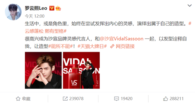 8月27日中午12點,沙宣官博官宣了羅云熙(明星代言公司)的代言,擔(dān)任的是品牌靈感代言人,有聯(lián)名的同款洗發(fā)水。