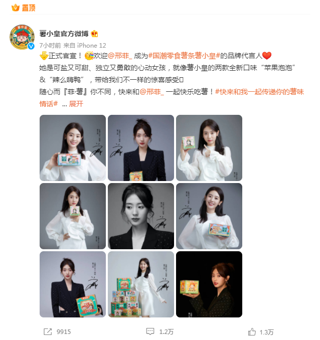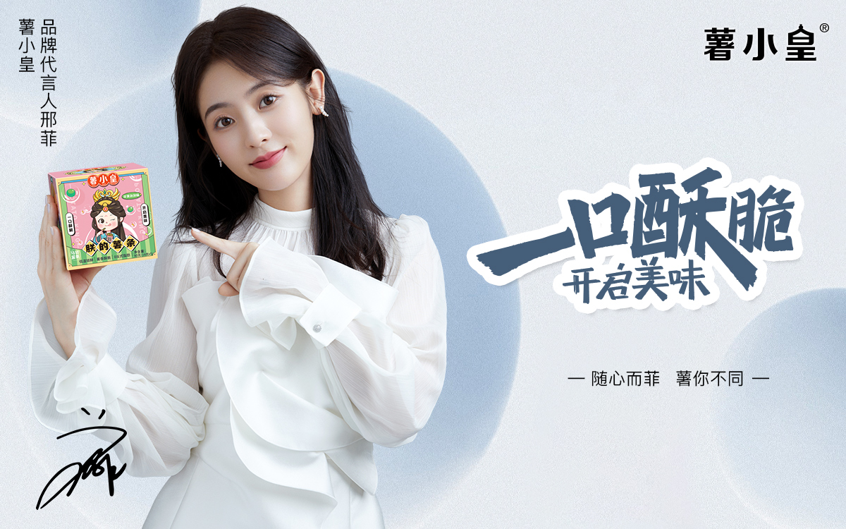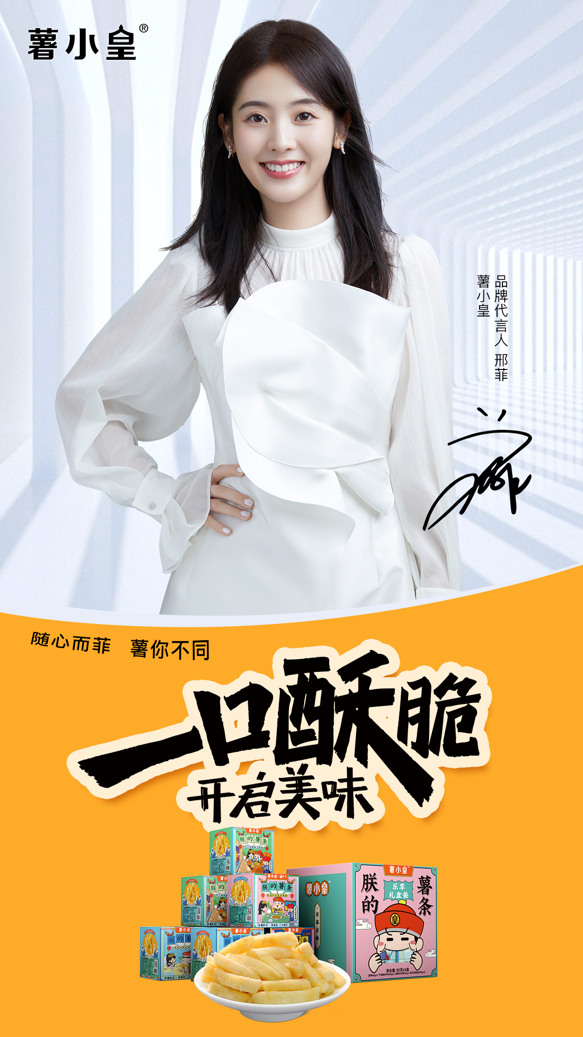 2022年9 月 26 日,新國潮薯條零食品牌「薯小皇」官宣邢菲(明星代言公司)為品牌代言人,并將推出「蘋果泡泡」、「辣么嗨鴨」兩種全新口味,面向消費者上市。