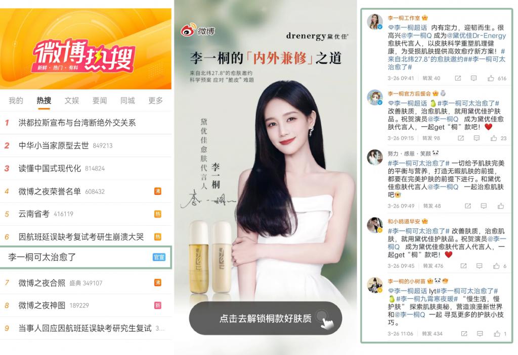 3 月 26 日 0 點," 黛優(yōu)佳愈膚代言人 " 微博開屏廣告上線,強勢攫取全平臺關注,話題 " 李一桐也太治愈了 " 迅速登上全國熱搜:在雙營銷動作的猛烈加持下瞬間吸引了大批網(wǎng)友的視線,引發(fā)大量討論。上午 9 點 6 分,黛優(yōu)佳官博正式發(fā)布海報,官宣李一桐為品牌首位代言人,李一桐工作室、李一桐官方后援會參與互動,網(wǎng)友紛紛點贊此次合作,將代言人官宣的熱度推向高潮,話題互動指數(shù)不斷攀升。