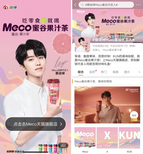 4月11日,Meco蜜谷果汁茶官宣全新品牌代言人蔡徐坤(明星代言公司),瞬時引爆,刷屏不斷!#蔡徐坤Meco蜜谷代言人#火速沖上微博熱搜話題榜單。官宣日當天全網(wǎng)曝光總量高達19億,互動量500萬,熱度非凡。可以說,Meco蜜谷果汁茶此次官宣,不僅深度觸網(wǎng)Z世代消費群體,也透露著其躋身行業(yè)一線品牌的決心。