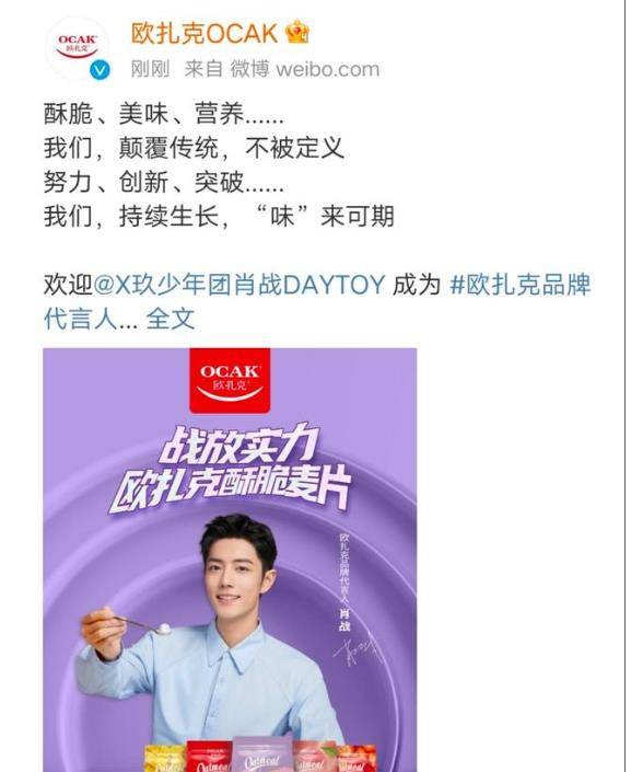 《歐扎克》品牌方在約定好的時間(10:05)正式更博官宣肖戰(zhàn)為品牌代言人,儀式感滿滿。歐扎克和肖戰(zhàn)一起,戰(zhàn)放實力,“味”來可期!
