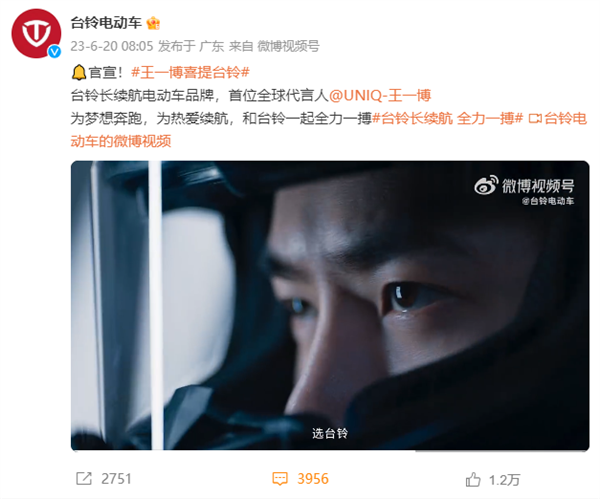 臺鈴電動車官宣首位全球代言人:王一博