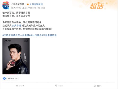 杰威爾微博官宣吳幸鍵成為品牌代言人
