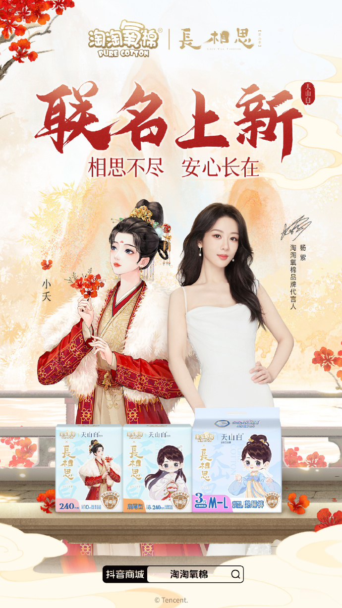 近日,淘淘氧棉與新開播電視劇《長相思 2》打造聯(lián)名新品,以品牌代言人楊紫(明星代言公司)在劇中的角色為設(shè)計靈感,打造聯(lián)名款包裝衛(wèi)生巾與品牌周邊,為粉絲觀眾帶來沉浸式追劇打 call 體驗。