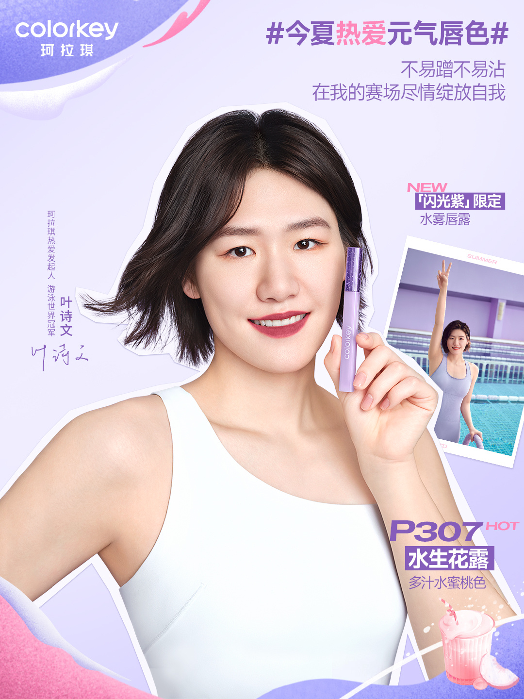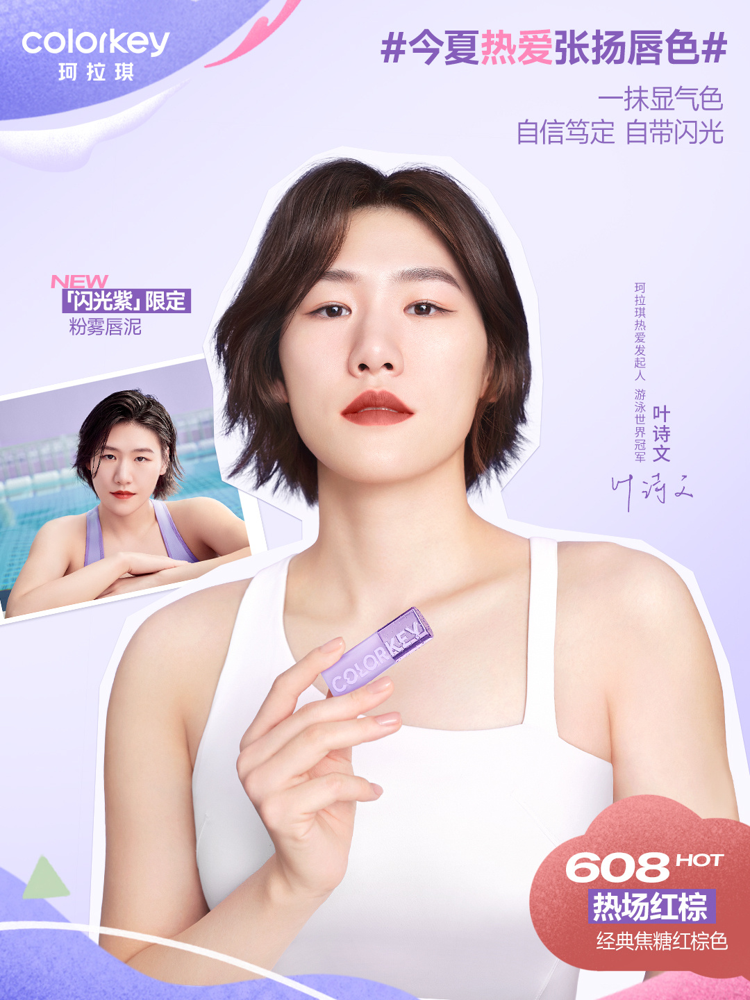 7 月 10 日,Colorkey 珂拉琪正式官宣游泳運(yùn)動(dòng)員葉詩文(明星代言公司)為品牌熱愛發(fā)起人,同步推廣品牌全新「閃光紫」限定系列。當(dāng)在色彩上不斷鉆研的 Colorkey 珂拉琪遇上因熱愛攀上巔峰的「泳」者葉詩文 ,二者將共同掀起潮流運(yùn)動(dòng)熱潮,帶上專屬熱愛「妝」備,一起「投入熱愛 自在閃光」。