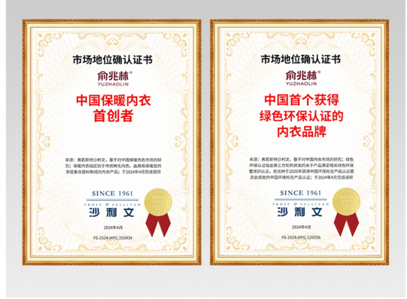 成立29年以來,俞兆林一直憑借產(chǎn)品創(chuàng)新占據(jù)著領(lǐng)先的市場地位。2024年,全球性的企業(yè)增長咨詢公司弗若斯特沙利文基于對中國保暖內(nèi)衣市場的研究,為俞兆林頒發(fā)了“中國保暖內(nèi)衣首創(chuàng)者”“中國首個獲得綠色環(huán)保認(rèn)證的內(nèi)衣品牌”兩大市場地位確認(rèn)證書。作為俞兆林最新打造的集恒溫發(fā)熱、凝熱鎖溫于一體的全新產(chǎn)品系列,御風(fēng)保暖衣不僅擁有發(fā)熱、抗菌、潤膚、環(huán)保等重磅功能,也將引領(lǐng)著行業(yè)保暖產(chǎn)品在科技、面料、工藝等多維度的升級。
