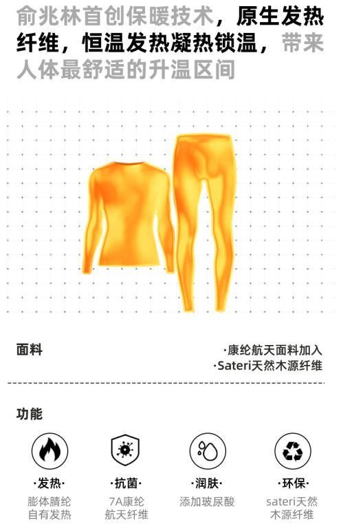在面料方面,該系列新品材質(zhì)由48%再生纖維系纖維、44.8%腈綸、7.2氨綸組成。膨體腈綸是擁有三層結(jié)構(gòu),具備蓄熱鎖溫科技,能自有發(fā)熱??稻]航天纖維屬于7A級別,能夠?qū)崿F(xiàn)物理抗菌,具備遠(yuǎn)紅外發(fā)熱以及防臭功能。產(chǎn)品還采用Sateri天然木源纖維,環(huán)保親膚不刺激。玻尿酸的添加,也讓御風(fēng)保暖衣可以具有潤膚保濕功效。同時,產(chǎn)品以雙面抓剪燙工藝制作完成,能幫助體感溫度升溫4.5°C。不止產(chǎn)品,俞兆林還重新定義高端系列御風(fēng)保暖衣的價格,每套售賣價僅為129元,通過對行業(yè)的引導(dǎo)力、用戶的洞察力,彰顯國民品牌作為行業(yè)領(lǐng)先者的價值與能量。