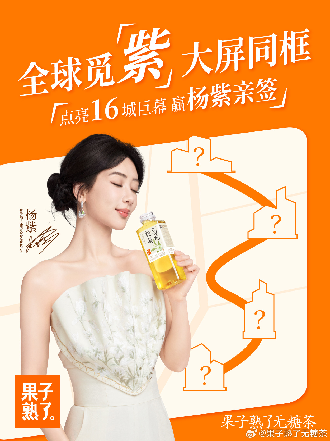 去年 5 月 6 日,果子熟了無糖茶官宣國民演員楊紫成為品牌代言人。時(shí)隔一年后,5 月 7 日,楊紫升任「果子熟了無糖茶全球品牌代言人」,并共同發(fā)布全新代言人 TVC。此外,品牌還推出了楊紫系列周邊,以滿足「紫米」們的需求。線下,果子熟了還在全球 16 城點(diǎn)亮大屏,用戶在線下拍照打卡,即有機(jī)會(huì)獲取親筆簽名照。