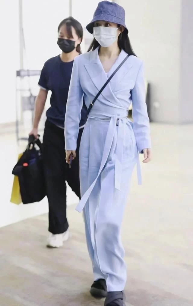 雖然這套衣服是西裝版型,但整體還是更偏向休閑風(fēng)。趙麗穎外出時,也更喜歡舒適的穿搭,于是她選擇了同色系的漁夫帽以及黑色厚底拖鞋。