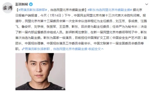 近日,男演員靳東添新職,當(dāng)選民盟北京市委副主委。