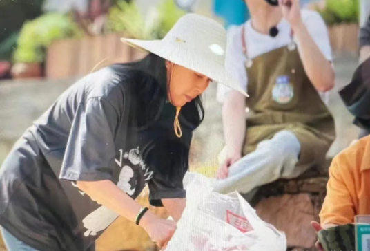 或許是天氣過于炎熱,沒過一會兒,那英拿起一頂草帽戴在頭上,并主動地為大家切著西瓜,絲毫沒有歌壇大姐的架子。