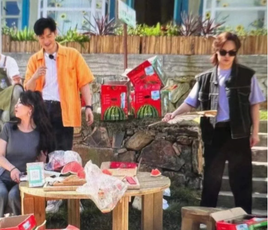 殷桃則坐在一旁,在她的面前擺放著一個圓桌,上面擺放著許多已經(jīng)切開的西瓜以及收款碼,一片狼藉,黃曉明與尹正等人則站在她的身后。