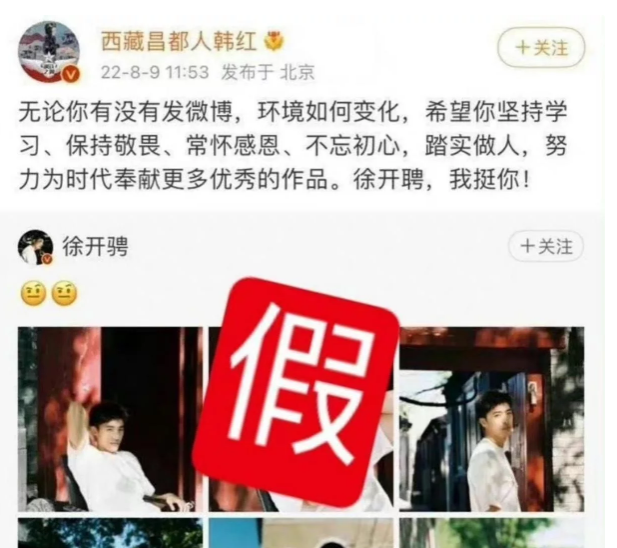 有網(wǎng)友分析稱,韓紅力挺徐開騁的截圖其實漏洞很大,“P圖里將徐開騁打成了“徐開聘”,而且翻找韓紅和徐開騁的微博內(nèi)容,其實也沒有直接將兩人聯(lián)系到一起的蛛絲馬跡,只能說造謠的成本太低啦!”