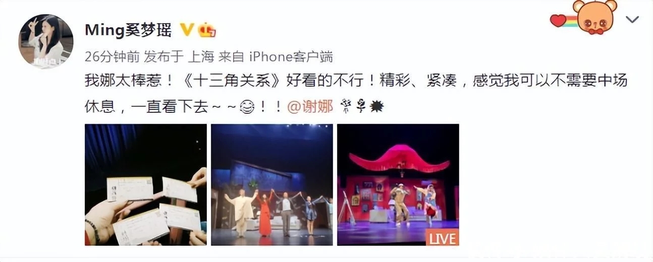 2022年9月24日,奚夢瑤(明星經(jīng)紀公司)在微博曬出觀看謝娜(明星經(jīng)紀公司)話劇的照片。奚夢瑤動情寫道:“我娜太棒惹!《十三角關系》好看得不行!精彩、緊湊,感覺我可以不需要中場休息,一直看下去。”