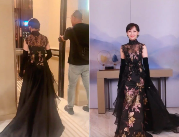 其中,趙雅芝身穿一件黑色拖地長裙,后面還添加了黑紗拖尾的點(diǎn)綴,戴著一副長手套,貴氣感十足,宛如小說中的豪門闊太。身材也是凹凸有致,這套裙子將她迷人的腰線也完美勾勒了出來。