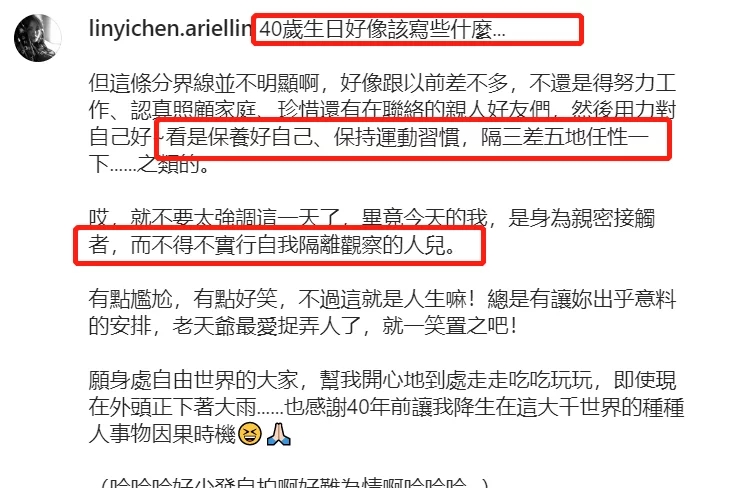 林依晨的40歲生日十分特別,由于此次情況特殊,她沒(méi)有辦法和家人團(tuán)聚舉辦趴體,只能獨(dú)自在房間里發(fā)文曬照。在長(zhǎng)文中,林依晨一邊感慨應(yīng)該在40歲生日這天寫(xiě)文留念,一邊又表示她并沒(méi)有感受到年齡帶來(lái)的任何變化,依舊要努力工作、照顧家庭、珍惜親友,此外也要愛(ài)護(hù)自己。盡管她正處于隔離之中,沒(méi)有親友陪伴身邊,但她表現(xiàn)得非常豁達(dá),希望網(wǎng)友們可以代替她自在享樂(lè)??此齐S意寫(xiě)下的一段生日感慨,其中似乎透出一絲不能與家人相聚的失落,更多的卻是一種淡然平和的態(tài)度。