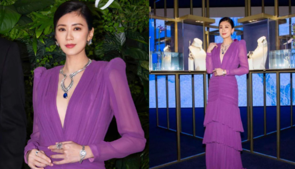 當(dāng)日賈靜雯穿著一襲紫色薄紗深V長(zhǎng)裙明艷動(dòng)人,皮膚白皙緊致身材勻稱,完全看不出是已經(jīng)生了三個(gè)娃年齡有48歲的女性。當(dāng)晚賈靜雯渾身上下戴滿了奢侈珠寶,比如脖子上的超大寶石項(xiàng)鏈,手上鑲滿鉆石超閃耀的手表和鉆戒,整個(gè)人就是貴氣逼人。