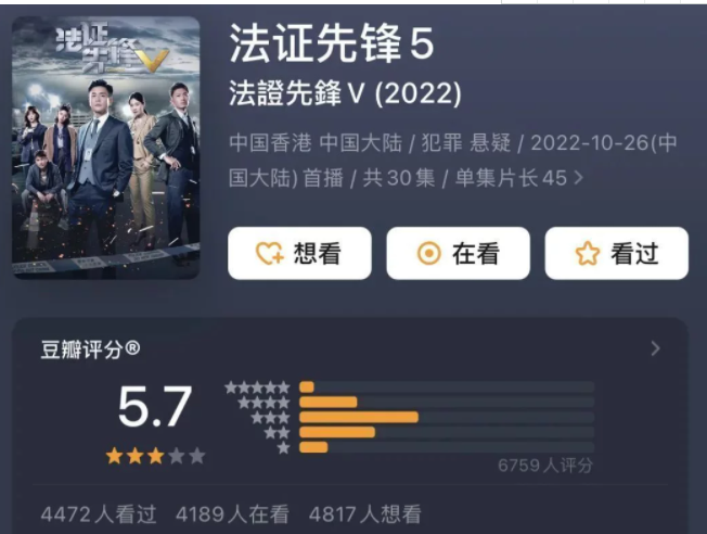 但是與高播放量形成反差的是,《法證先鋒5》豆瓣開分成績6分,剛剛達(dá)到及格線,截至發(fā)稿前,共6759人給出評價,超四成用戶打出3星,評分僅5.7分。