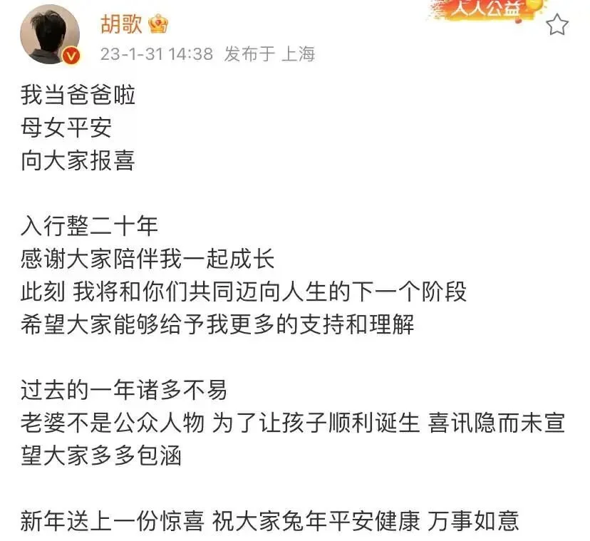 胡歌發(fā)文稱自己當(dāng)爸爸了,他表示妻子不是公眾人物,為了讓孩子順利誕生,故隱而未宣。