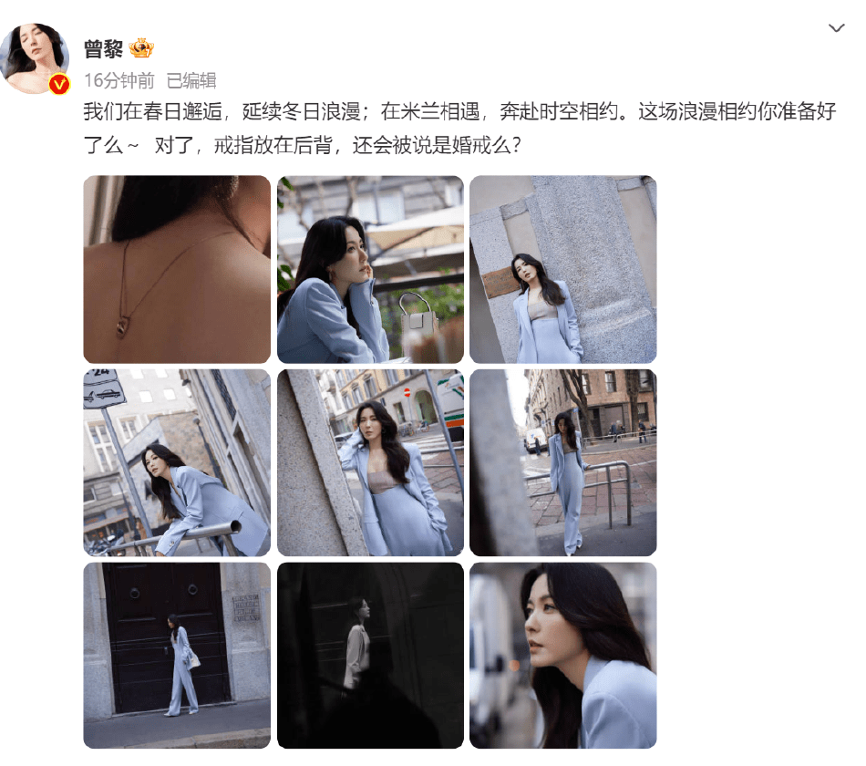 此前,曾黎現(xiàn)身米蘭參加時裝周,并在社交平臺上曬出近照,卻意外被網(wǎng)友發(fā)現(xiàn)她的無名指上戴有素圈戒指,引發(fā)戀情猜測。