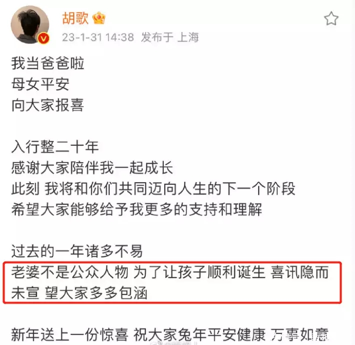 娛樂圈內未婚先孕,奉子成婚的先例也不是沒有。只不過沒想到胡歌也會這樣做,直到孩子出生下一步該考慮上戶口了,才選擇官宣這個消息。
