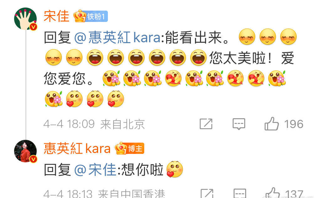 當天,惠英紅在評論區(qū)高調(diào)表白宋佳“我想你了” ,宋佳(明星代言公司)回應(yīng)道:“能看出來,您太美啦!愛您愛您。”隨后,宋佳又表示:“我約您能約到嗎?”惠英紅稱:“你約我能約不到嗎?你少飛一點,少親兩口別的美女,就能擠出時間跟我拍雜志了。”二人互動十分逗趣,關(guān)系超親密。