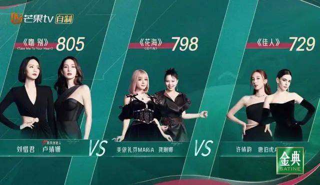 盧靖姍(盧靖姍經(jīng)紀公司)、劉惜君(劉惜君經(jīng)紀公司)深情對視演繹中英版《吻別》,最終得分805,超過了同為兩人組的龔琳娜、美依禮芽《花?!返?98分。