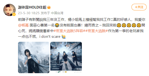 5月30日,謝依霖(明星代言公司)在社交平臺(tái)上發(fā)文稱自己時(shí)隔多年重新回歸《密室大逃脫5》,“作為第一季的老玩家,我一點(diǎn)也不慌,i don't scare”。她透露道:“前陣子有新聞?wù)f我三年沒(méi)工作,楊小姐馬上積極幫我找工作。真的好感人,我愛(ài)你@楊冪 ”,謝依霖還調(diào)侃楊冪是面惡心善第一名,之后馬上改口稱“沒(méi)有啦面也善!總而言之~我回來(lái)啦,開(kāi)心死,媽媽賺錢養(yǎng)家中。