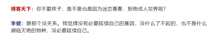 近日,李?。餍墙?jīng)紀(jì)公司)曾經(jīng)的采訪再被曝光引發(fā)熱議,李健被問(wèn)到“你不要孩子,是不是也是因?yàn)槊詰偾啻海芙^成人世界呢?”李健回應(yīng)道:“跟那個(gè)沒(méi)關(guān)系。我覺(jué)得沒(méi)有必要延續(xù)自己的基因,沒(méi)什么了不起的,也不是什么瀕臨滅絕的物種,沒(méi)必要延續(xù)自己。”