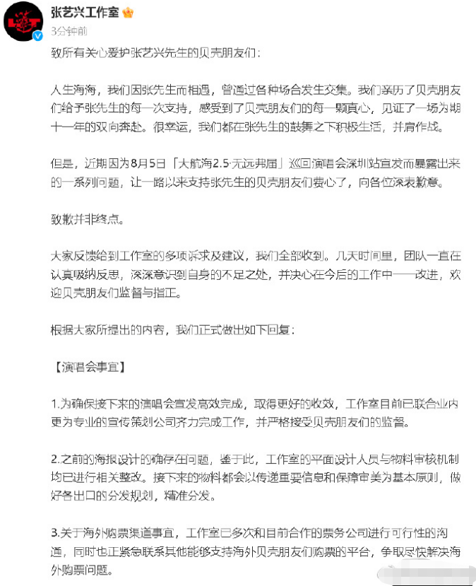 6月7日,張藝興(明星經(jīng)紀(jì)公司)工作室向長(zhǎng)文向粉絲道歉,并再次回應(yīng)粉絲訴求,就演唱會(huì)、日常宣傳、與粉絲溝通、妝發(fā)服攝、人員整改等問題做出回復(fù)。工作室還表示將重新出發(fā),用更高效、更踏實(shí)、更謙遜的方式守護(hù)大家共同的事業(yè)。