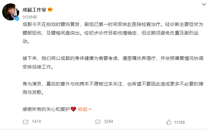 成毅工作室回應拍戲受傷:腰傷復發(fā)目前傷情穩(wěn)定