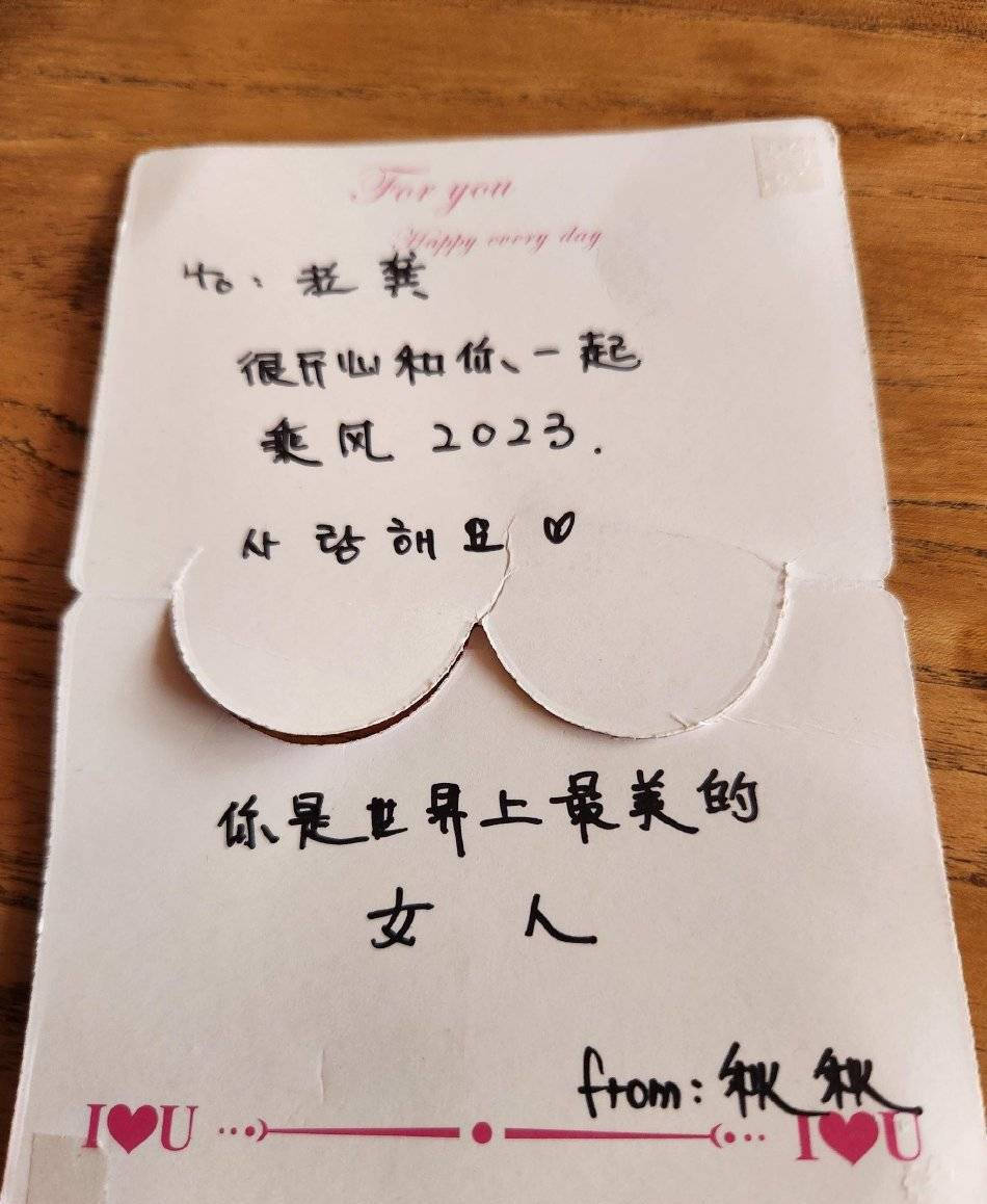 6月9日,龔琳娜(明星經(jīng)紀(jì)公司)社交平臺(tái)曬照,并配文:“收到來自韓國的秋瓷炫姐姐的禮物卡片,秋秋愛飲茅臺(tái)酒,歡迎有空去我家鄉(xiāng)貴州。 ”