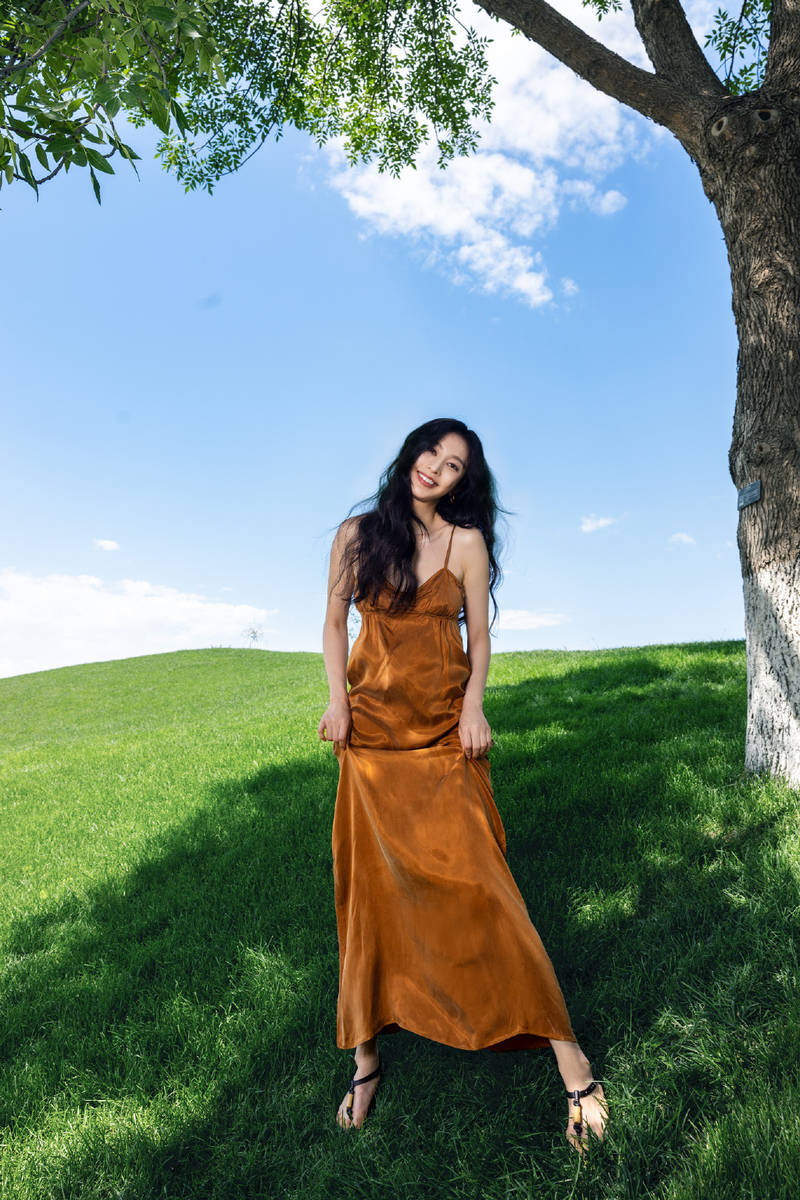 張儷在草原上玩轉(zhuǎn)歪頭擺拍。