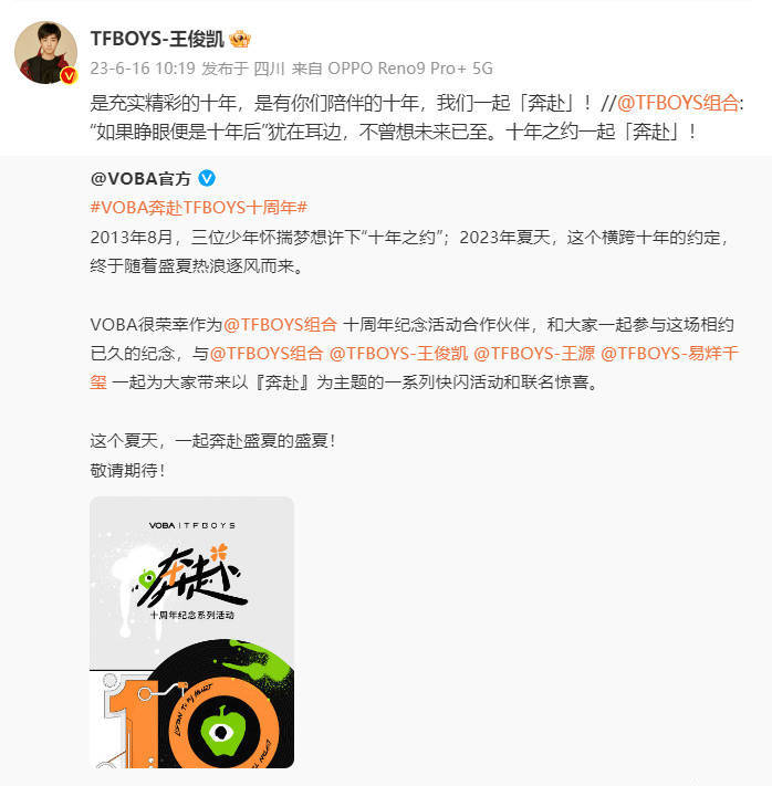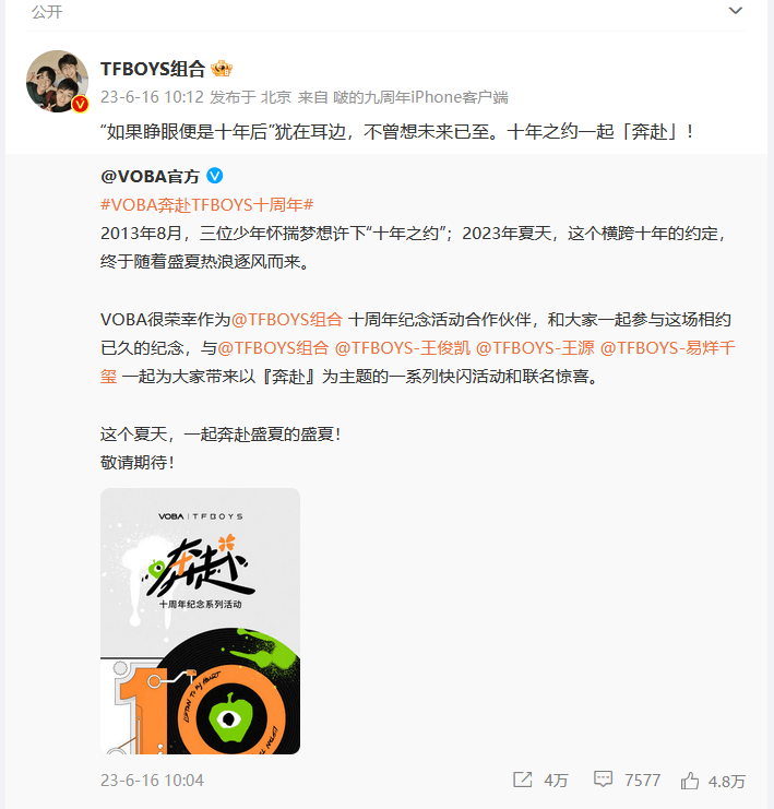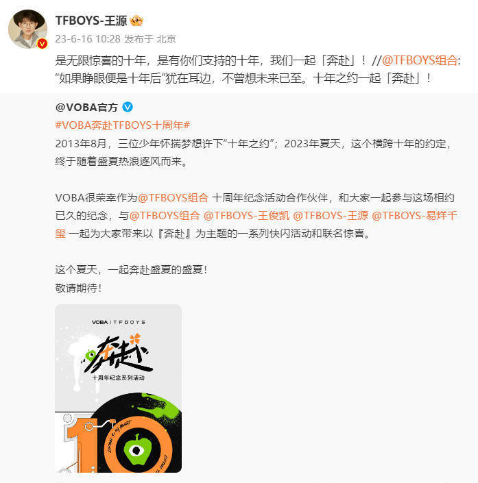6月16日,TFBOYS(明星經(jīng)紀(jì)公司)十年之約紀(jì)念活動(dòng)官宣,王俊凱、王源、易烊千璽在社交平臺(tái)官宣TFBOYS十年之約,與三位少年奔赴十年之約!