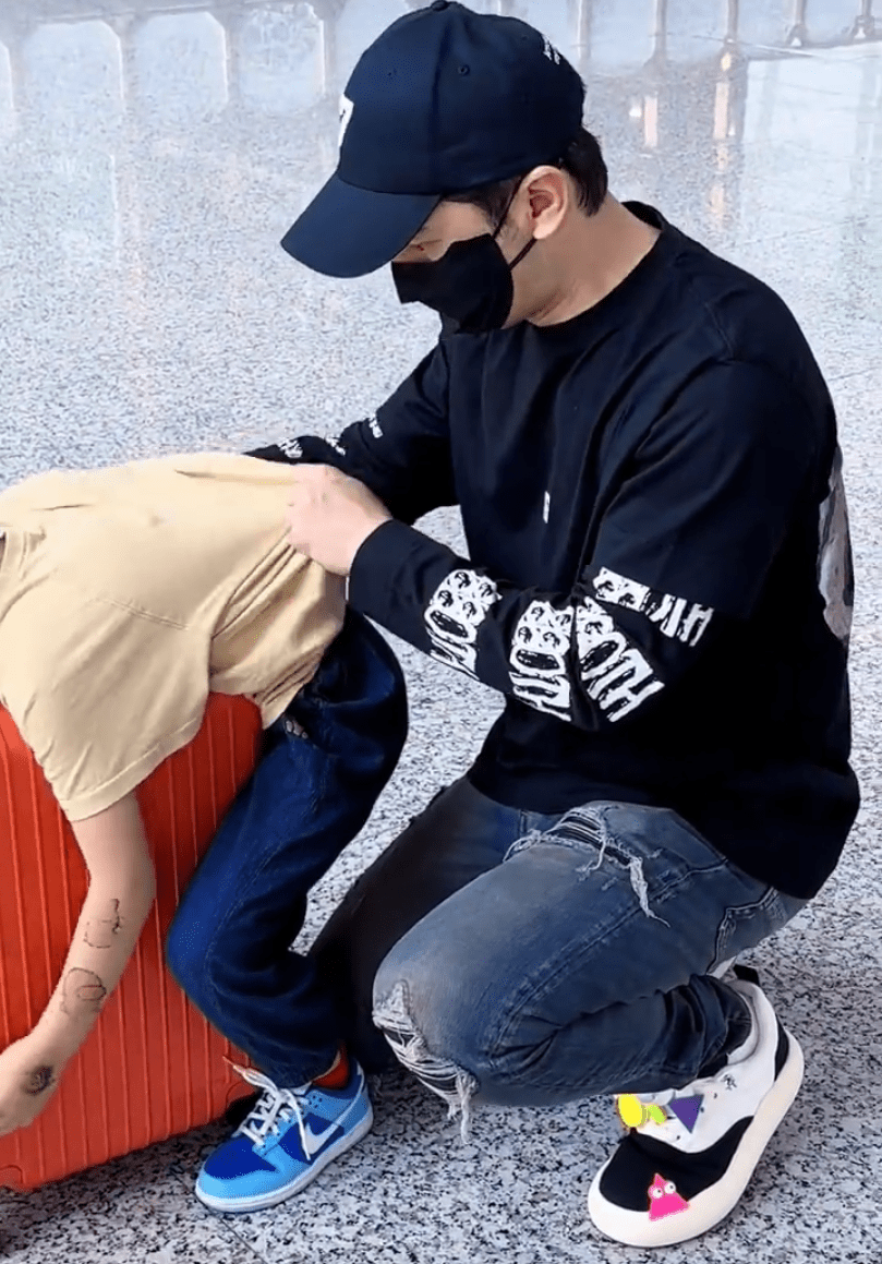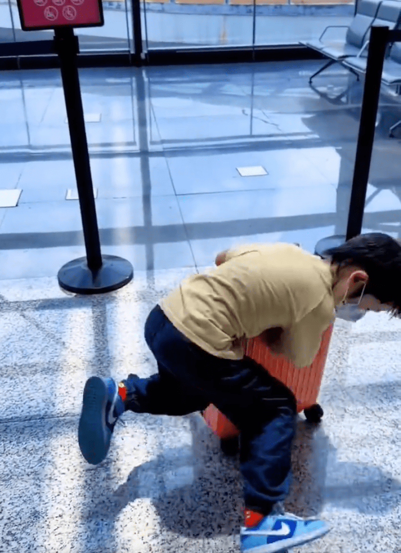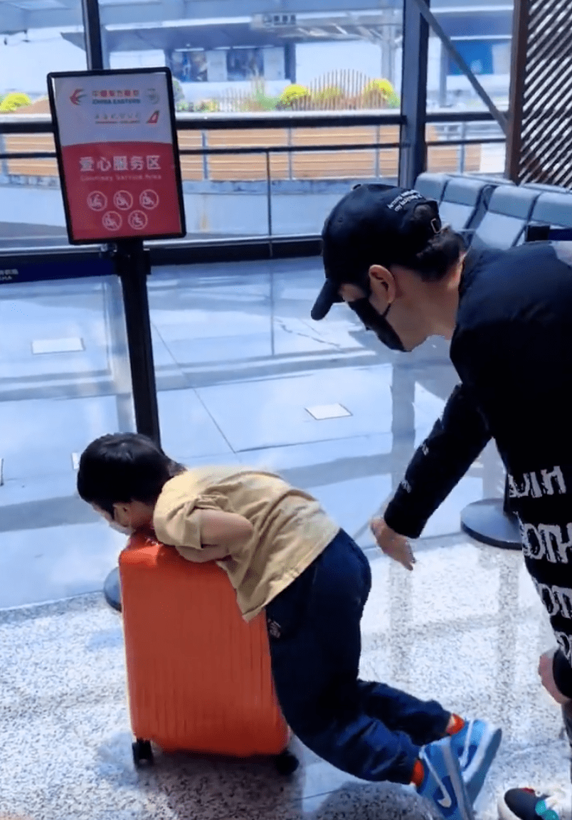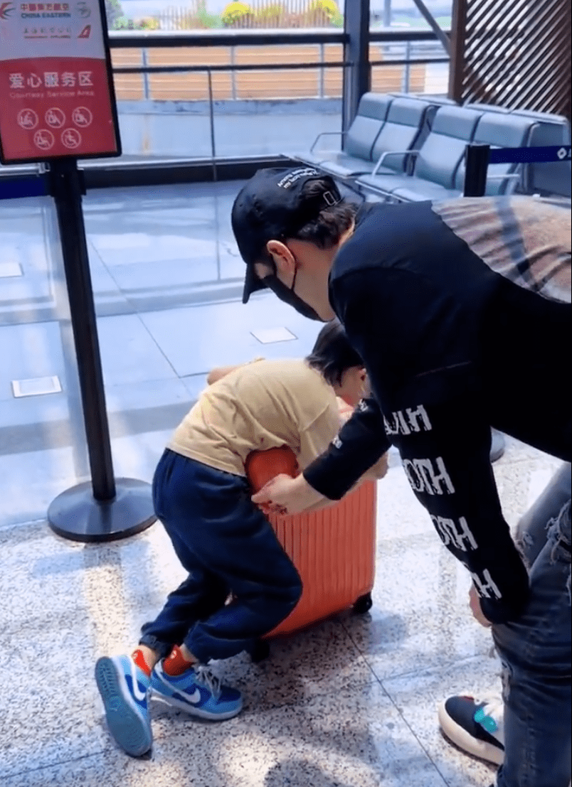 黃曉明帶著兒子現(xiàn)身機場 小海綿玩轉(zhuǎn)行李箱超可愛