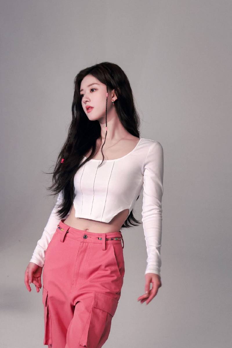 趙露思身穿白色露腰上衣,秀出小蠻腰。