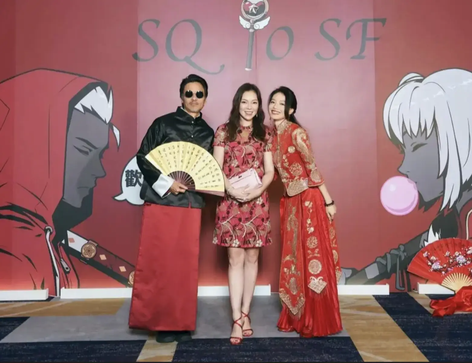 二人都穿中式婚服,一個(gè)戴墨鏡搖扇裝酷,一個(gè)笑容甜美,畫面溫馨,感情超好。