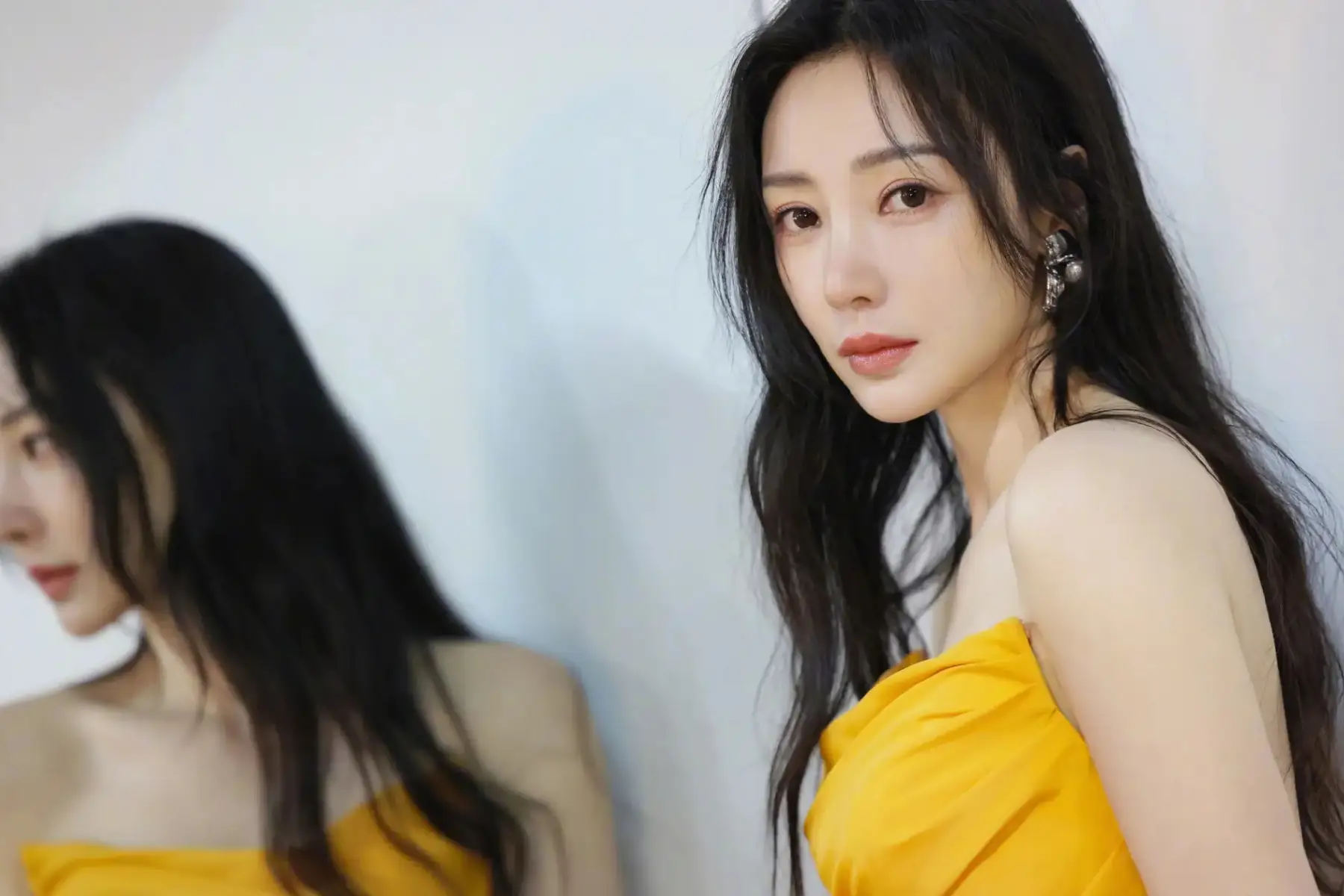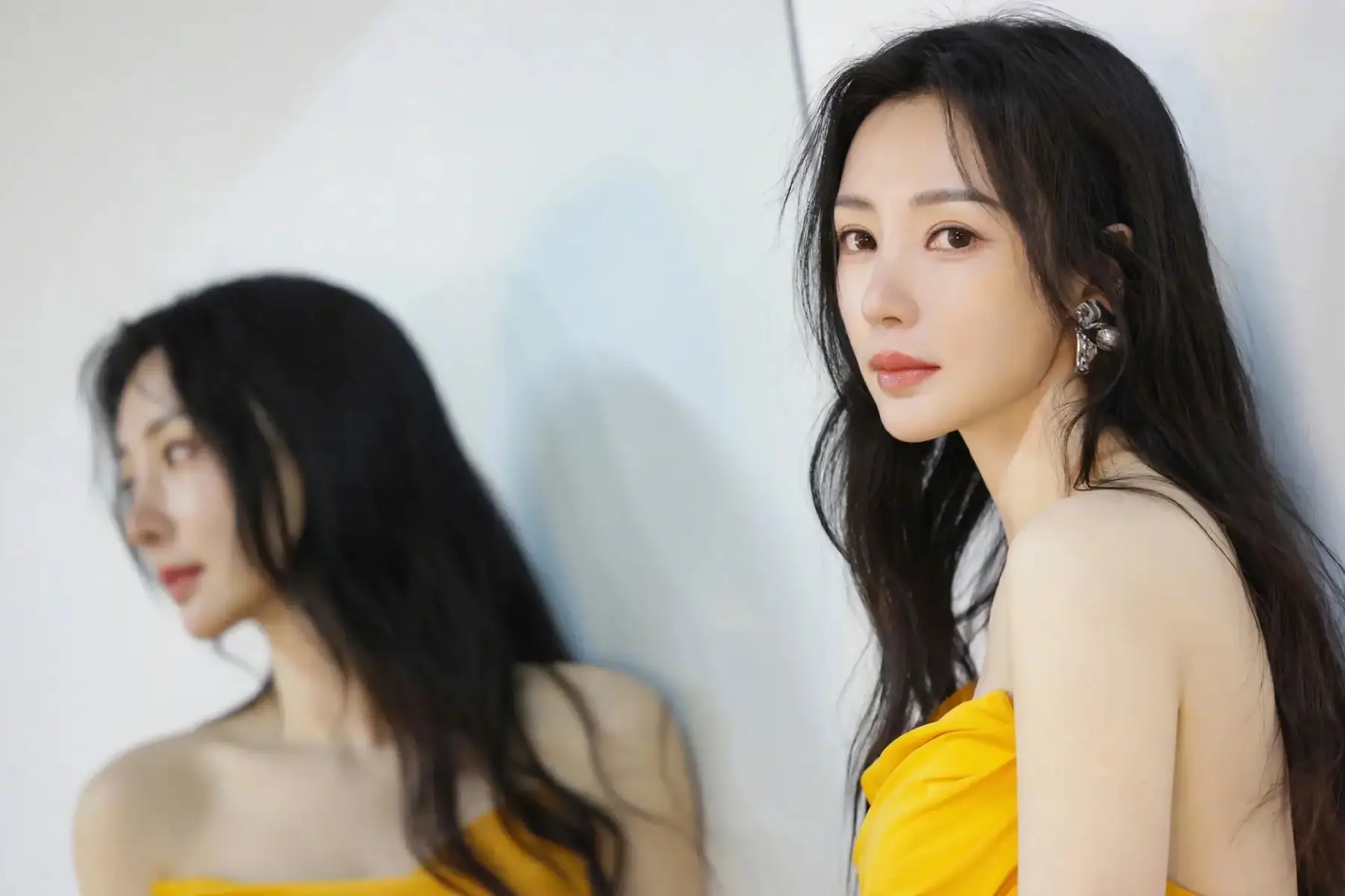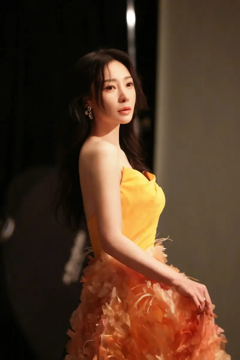 4月24日,柳巖在個人社交賬號曬出了一組身穿橘黃抹胸裙的造型圖。