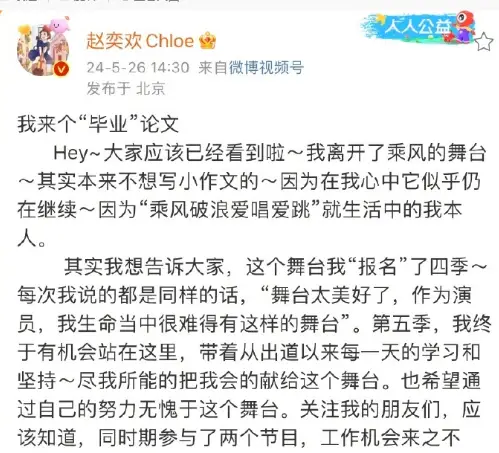 5月26日,趙奕歡發(fā)長文遺憾告別《乘風(fēng)2024》 舞臺,表示“謝謝邀約,信任,感恩生命給我如此美好的舞臺上的體驗”,談到乘風(fēng)遺憾,趙奕歡說“遺憾肯定有,比如沒有更多不一樣的造型、舞臺,但我們未來還有其他更多的舞臺,所以這也是一個新的開始”。