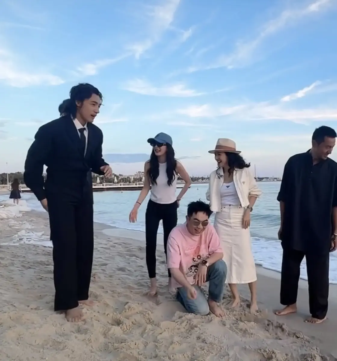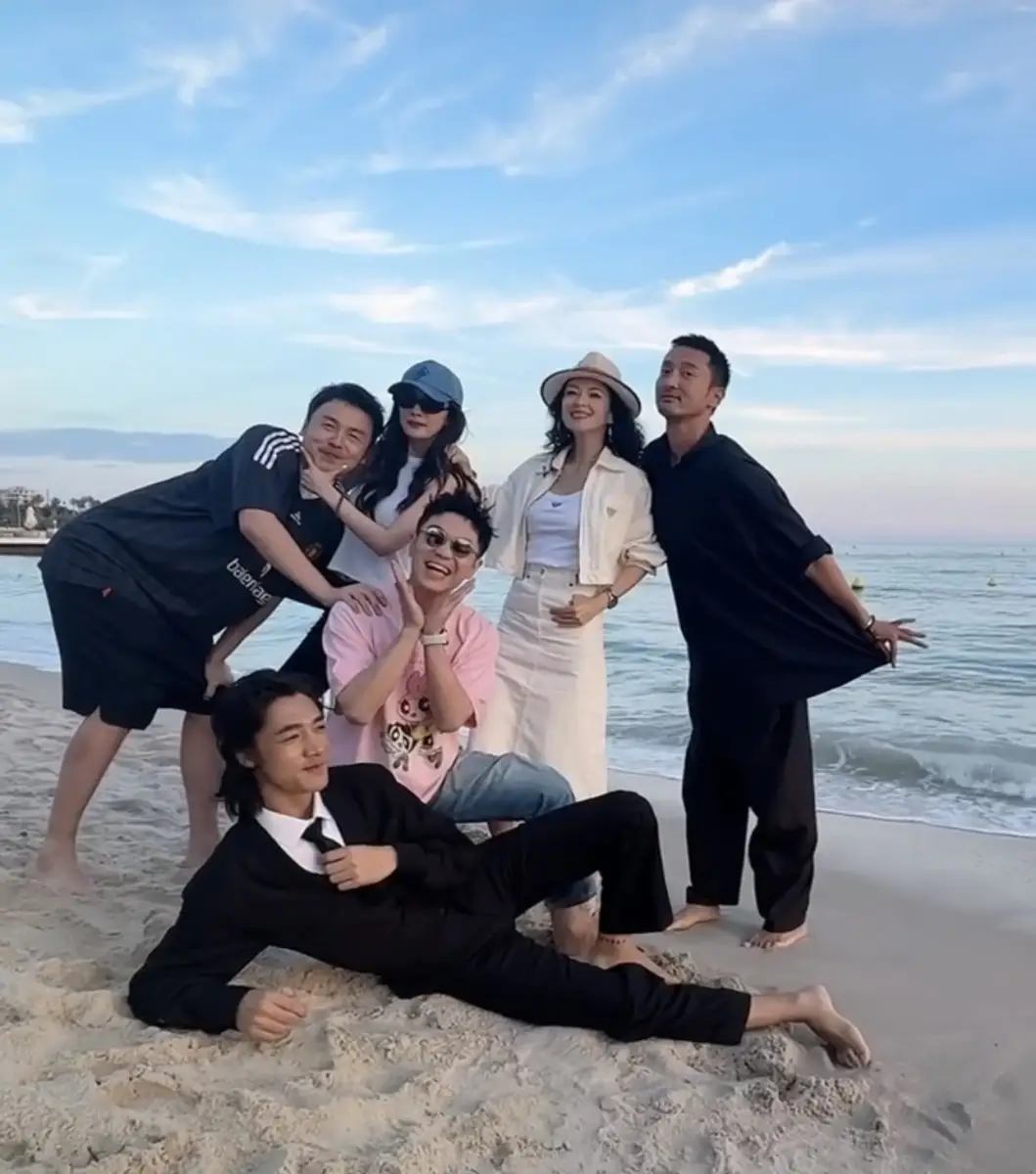 5月26日,章子怡在社交平臺曬《醬園弄》劇組合照,和楊冪、雷佳音、大鵬、此沙、王傳君沙灘玩鬧,氛圍超好。