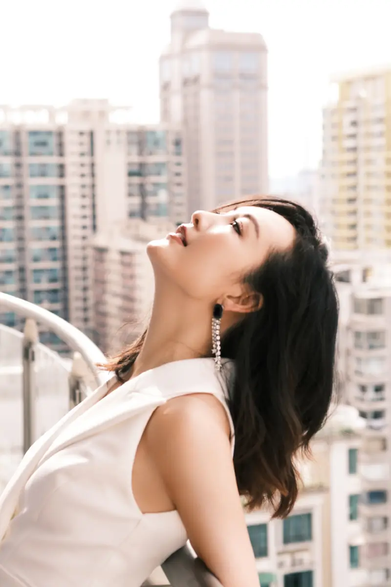 王鷗仰頭擺拍,嘴角勾勒出一抹淺淺笑容。