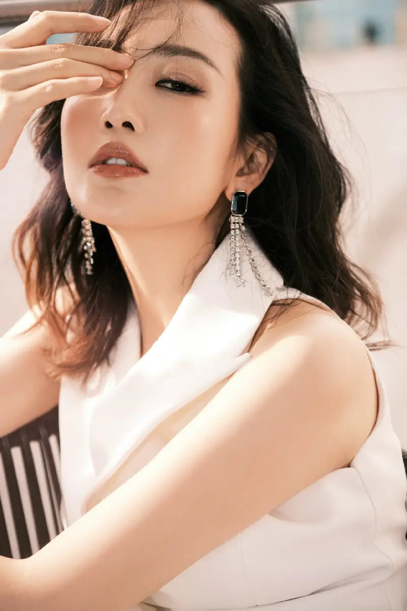 王鷗身著白色無袖長裙勾勒曼妙身姿。