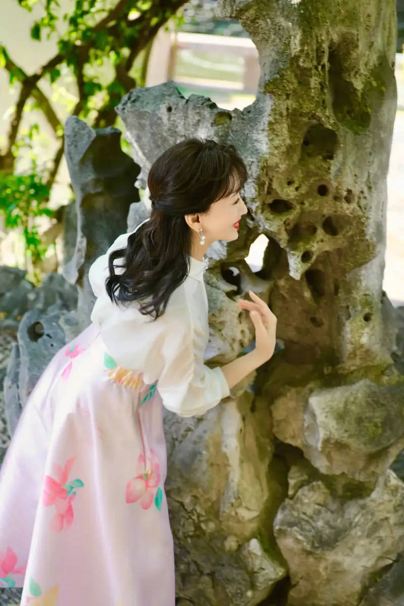 趙雅芝站在假山石頭旁邊,想在躲貓貓一樣,超有少女感。
