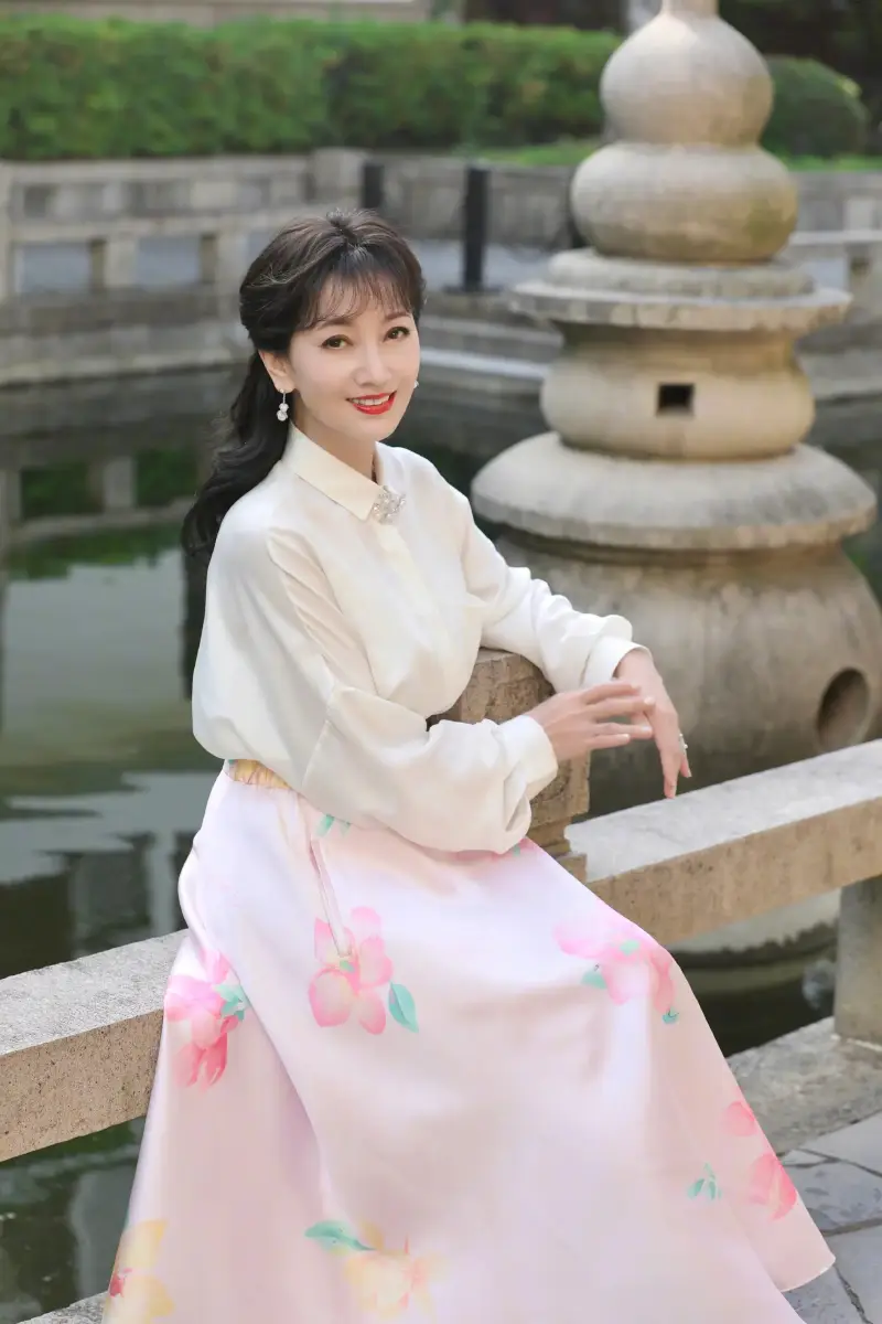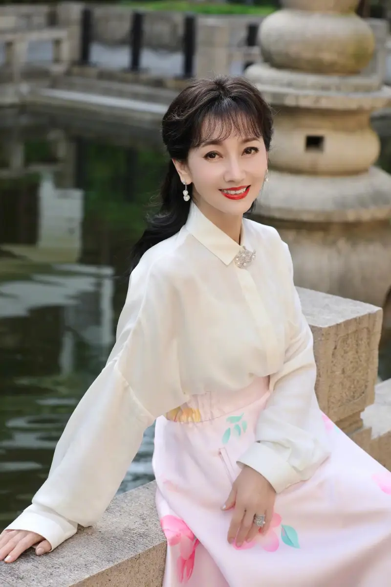 趙雅芝坐在水池旁拍攝美照。