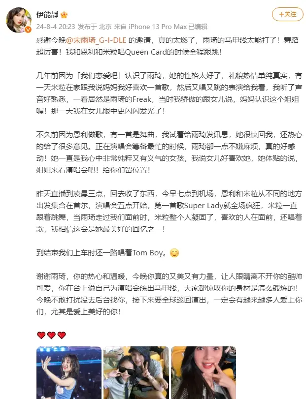 伊能靜發(fā)長文感謝宋雨琦,并開啟花式贊美!