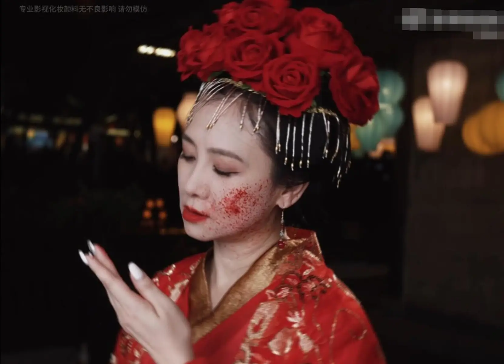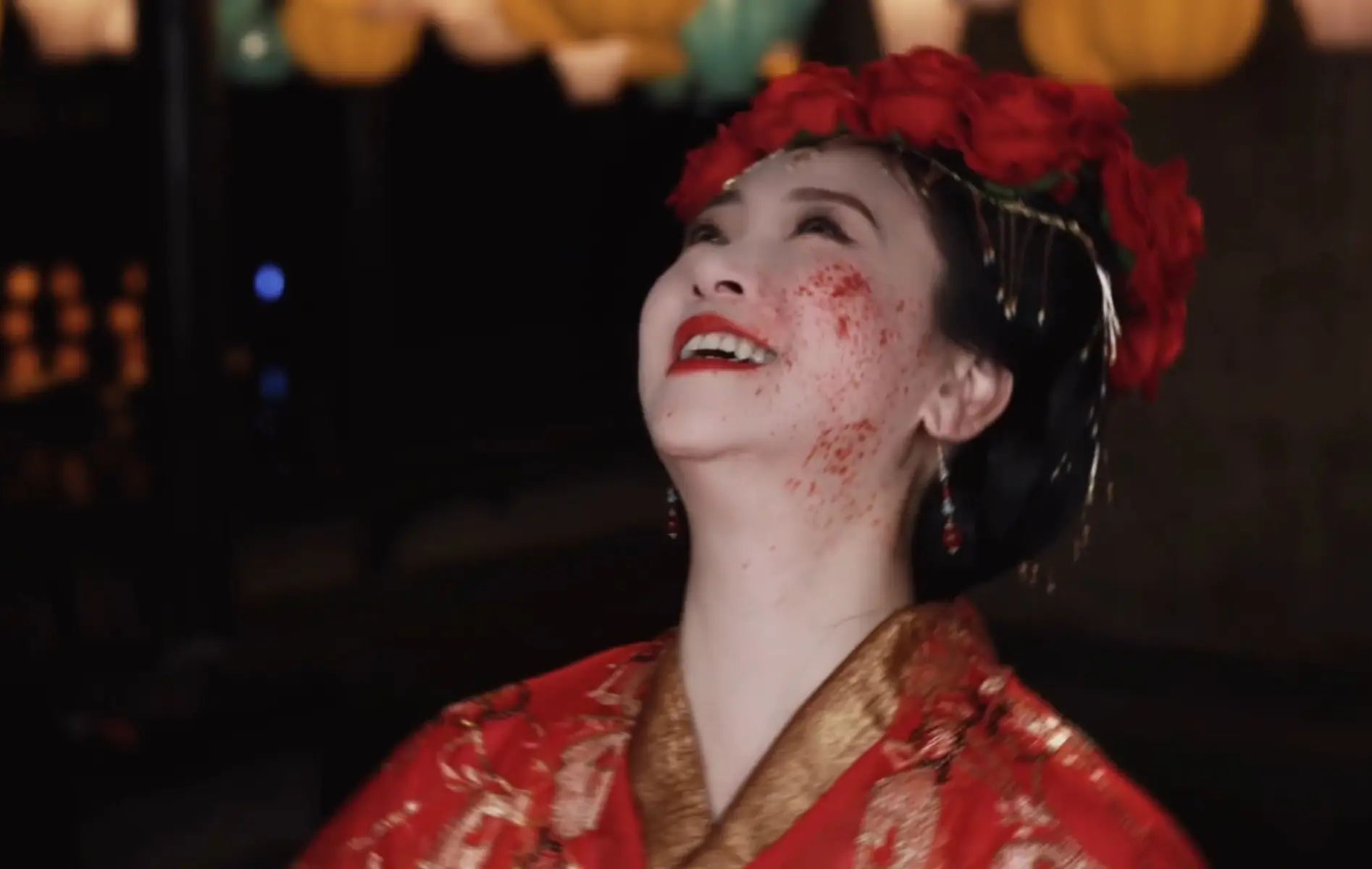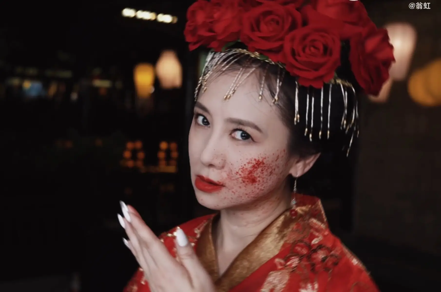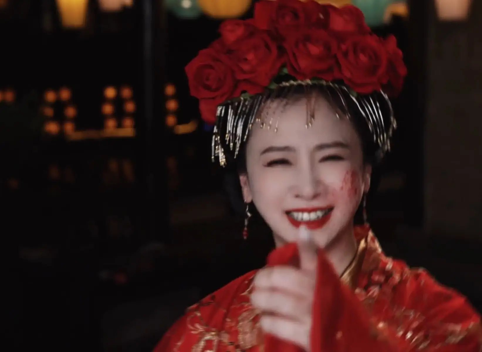 翁虹開懷大笑,搭配臉上的血跡,笑容邪魅,有種鬼新娘的感覺。