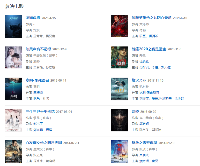 代表作品:隋唐演義、傾世皇妃、新蕭十一郎、小樓又東風、媽祖、武當、秦王李世民、水滸傳