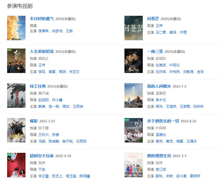 代表作品:相愛穿梭千年2、青春警事、關于唐醫(yī)生的一切、平凡的榮耀、愛的理想生活、人生若如初見、毛岸英、蘇菲日記、指縫里的光